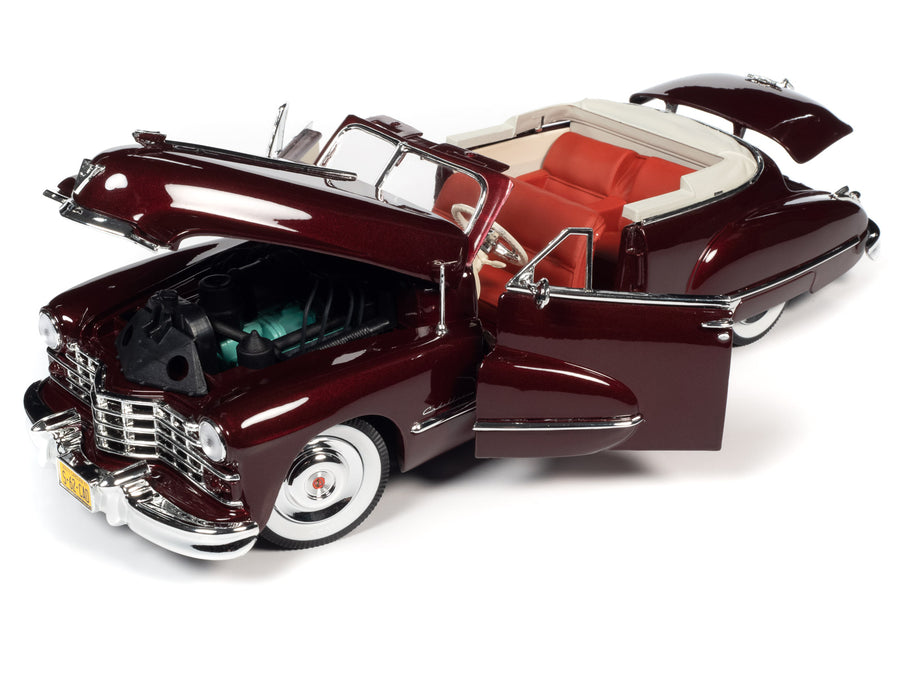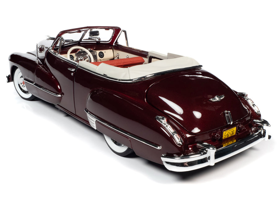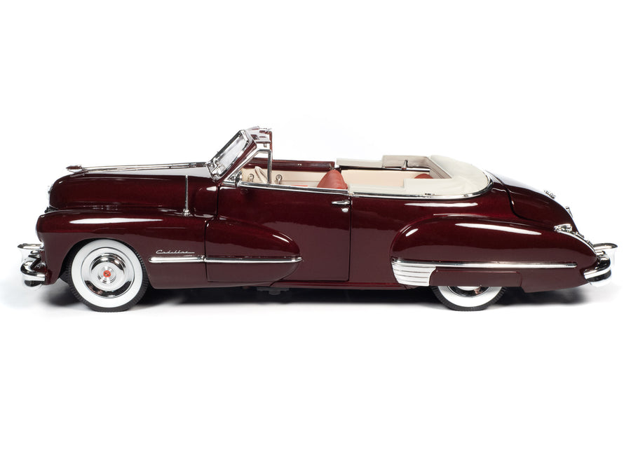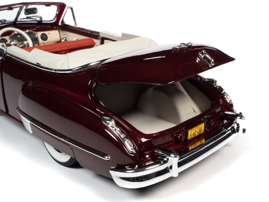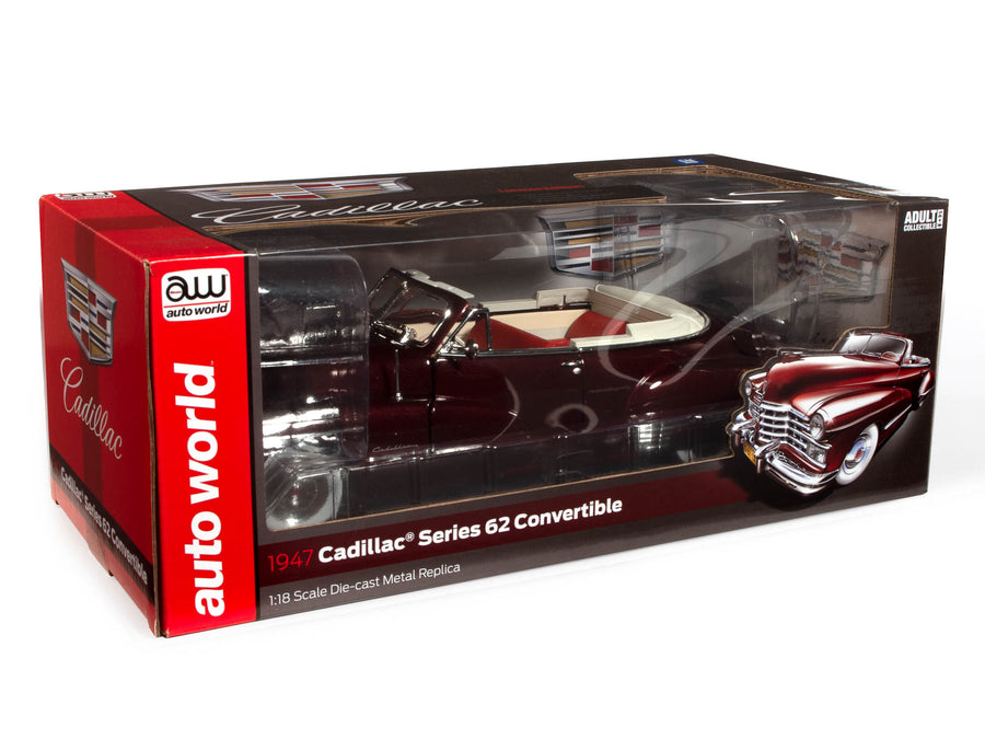 Нова модель автомобіля 1947 Cadillac Series 62 Convertible Burgundy Metallic у масштабі 1/18 від Autoworld.