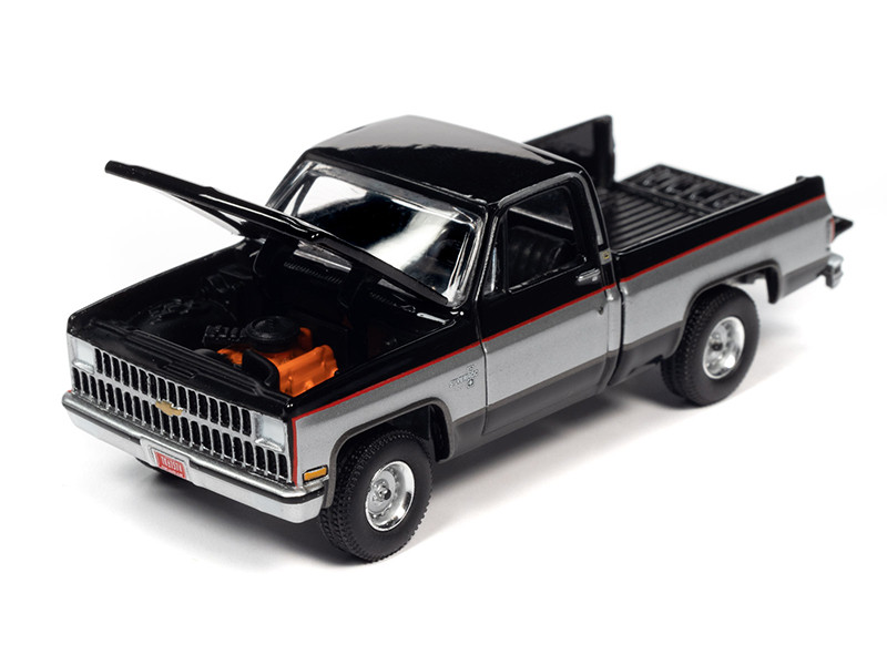 6) 1981 Chevrolet Silverado 10 Fleetside Pickup Truck Midnight Black and Silver Metallic.